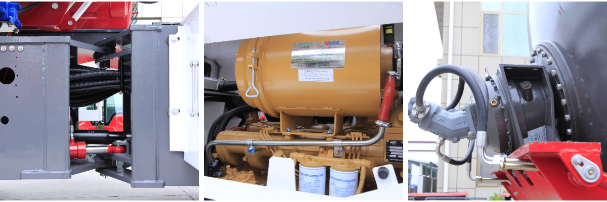 Die Gesamtabmessungen dieses Fahrmischers betragen 4800 × 2350 × 3080 mm (Hubarm) und 5900 × 2350 × 2660 mm (Fallarm), bei einem Radstand von 2100 mm und einem Gesamtgewicht von 3500 kg. Dank seiner kompakten Größe findet er problemlos in verschiedenen engen Arbeitsumgebungen seinen Platz. Reifen der Größe 20.5-16 zeichnen sich durch eine gute Verschleißfestigkeit aus und gewährleisten so eine stabile Fahrt des Fahrzeugs auch unter schwierigen Straßenbedingungen.